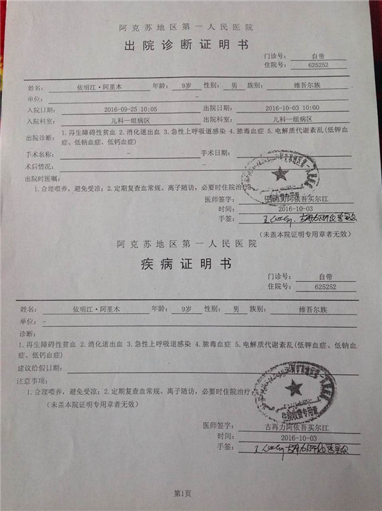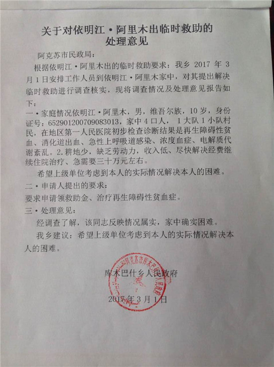 新疆民生网讯 阿克苏市水利局驻巴什巴格村工作队在入户走访中得知该村1组农民阿里木·吐尼亚孜的长子依明江·阿里木在阿克苏地区人民医院初步检查诊断结果为再生障碍性贫血、消化道出血、急性上呼吸道感染、浓度血症、电解质带紊乱。依明江·阿里木于2007年9月8日出生,今年10岁,为了争取最佳治疗时间,依明江·阿里木要尽快住院治疗,需要65万元左右治疗费。阿里木·吐尼亚孜家有四口人,耕地少、缺乏劳动力、收入低,根本解决不了这笔昂贵的医疗费用。阿克苏市水利局驻巴什巴格村工作队了解了他家的实际困难后筹钱支付了医药费用,但无法支付昂贵的医疗费用,为帮助他们发布了这篇求助信息,需要广大爱心人士及团体伸出援助之手。