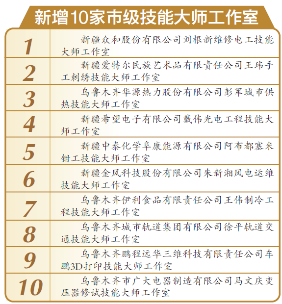 新疆网讯(记者史传芝)12日,乌鲁木齐市新增的10家技能大师工作室获授牌。各工作室将获得的建设经费支持从过去的6万元提高至10万元。
