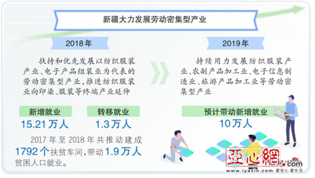 数据显示:2018年,新疆坚持扶持和优先发展以纺织服装产业、电子产品组装业为代表的劳动密集型产业,推进纺织服装业向印染、服装等终端产业延伸,就业人数持续增加。劳动密集型产业新增就业15.21万人,成为新疆南部就业的中坚力量。新疆连续两年每年转移就业1.3万人,共推动建成1792个扶贫车间,带动1.9万贫困人口就业。