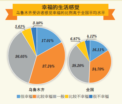 根据“调查明信片”中调查的19项数据中的“您对目前生活的感受是?”项目统计,过去一年,全国50.81%的受访者感到幸福,而乌鲁木齐市受访者感觉幸福的比例为54.25%。