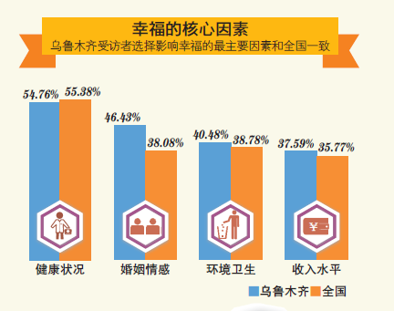“大调查”结果显示,影响乌鲁木齐市受访者幸福最主要因素是健康状况、婚姻感情和环境卫生,和全国受访者选择相同。其中,乌鲁木齐受访者对婚姻情感的关注度高于全国平均水平。