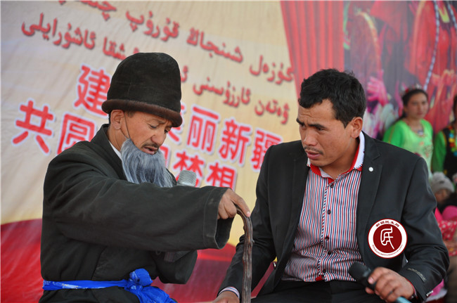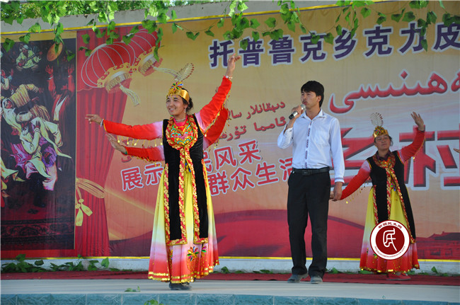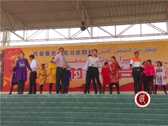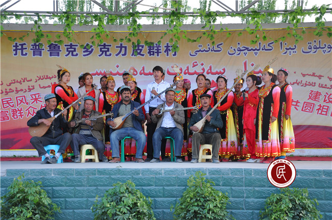 “访惠聚”活动开展以前,受极端宗教氛围的影响,村民们有歌不敢唱,有舞不敢跳,丧礼不能哭,婚庆不能笑,村里已许久不见往日的欢声笑语。工作组入住后,就文化宣传工作多次与村班子沟通交流,并主动与乡文化站的两位老艺人阿那耶提·阿巴克和布拉比耶姆·艾薇拉座谈,通过谈心谈话交流文艺工作的看法。为弘扬民族传统文化,抵制极端宗教影响,两位老艺人不顾年老多病,毅然决定挺身而出,协助工作组和村班子组建文艺队伍。起初,村民们或多或少有些顾虑,工作组在了解这一情况后,一方面和村班子、老艺人亲自上门做工作,并利用每周一的村民大会宣讲政策,鼓励大家踊跃报名;另一方面,在农闲、婚嫁和节日时,由老艺人带领大家即兴表演,共庆良辰吉日。随着去“极端化”工作的深入推进和极端宗教氛围的逐渐淡化,在工作组、村班子和老艺人的带领下,大家慢慢地重新回到了舞台上,田间地头、巷尾农院也渐渐地再次响起了大家的欢声笑语。