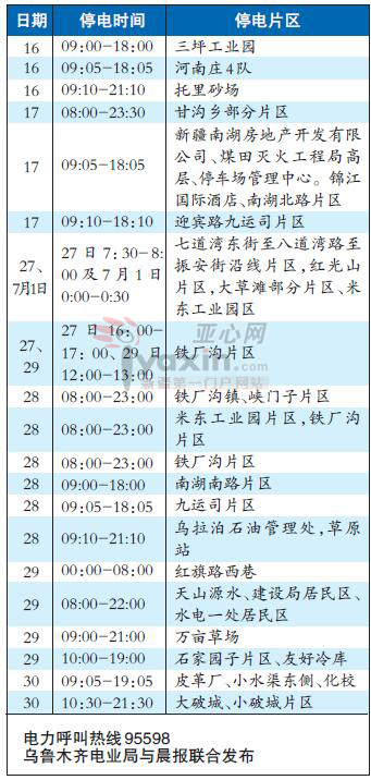 都市消费晨报、亚心网全媒体快讯(记者 宗合)5月25日,晨报全媒体记者从乌鲁木齐电业局了解到,6月上旬,乌鲁木齐以下片区将因设备检修停电,请相关片区单位及居民提前做好准备。