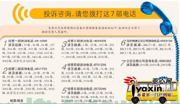 乌市公交集团有限公司相关负责人介绍说,公交车是一个城市的窗口,早在2011年,他们就对外公布过一批各经营部服务投诉等相关电话号码,市民反馈较好,公交服务得到很大提升。但由于此前公布的很多电话号码已变更,还有一些180段的手机号码也停止使用,为做好公交冬运工作,提高整体服务水平,现在对外公布最新的服务投诉电话。