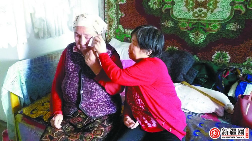 图为11月3日,在水上乐园社区康居苑小区阿依古丽·尼亚孜的家中,说起张红枫和自己的姐妹情,老人忍不住热泪盈眶,张红枫心疼地给她擦眼泪。(记者饶俊华摄)