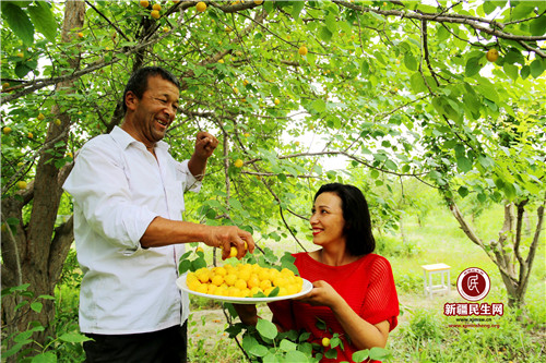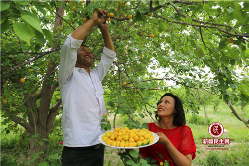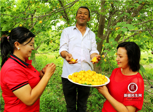 新疆民生网颜寿林)7月1日,游客在温宿县阿热勒镇托万克买盖提村一家农业生态园采摘杏子。近年来,温宿县注重打造“农旅融合”特色产业,带动当地村民特别是贫困群众增收,加快建设美丽乡村。
