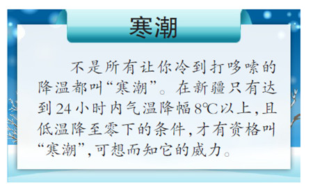 11日16时,新疆气象台发布寒潮蓝色和大风蓝色预警信号:当日夜间到14日白天,北疆大部、哈密市北部降雪,气温下降8℃-10℃,将出现寒潮,同时上述大部区域有5级左右西北风,博州阿拉山口、塔城地区老风口和玛依塔斯风区、阿勒泰地区闹海风区、克拉玛依市等风口阵风7-8级,乌鲁木齐市达坂城至吐鲁番市的三十里风区、吐鲁番市鄯善县至哈密市的百里风区阵风9-10级。