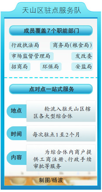 据天山区商务局(粮食局)稽查大队大队长、首批入企驻点服务队队长曾海明介绍,服务队将轮流入驻天山区辖区各大型综合体,利用1至2个月的时间为综合体内商户提供政策解答、工商注册、行政手续审批等服务。通过实行全程领办、帮办、代办的方式,实现企业服务每个审批事项“最多跑一次”。