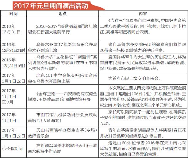 12月28日,市委宣传部公布了乌鲁木齐市2017年元旦、春节期间系列文化活动,即日起至2017年2月,将共组织各类文化活动270场次。与往年“两节”文化活动相比,2017年首府元旦、春节文化活动以“喜庆、文明、多样、参与”为原则,突出“弘扬传统文化、打造首府特色”的特点。