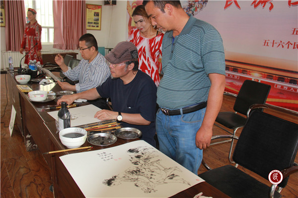 新疆民生网(阮莉莉)为深入贯彻落实党的十九大精神,进一步传播先进文化、弘扬中华文化,丰富和活跃基层农民群众精神文化生活,5月3日,阿克苏地区政协根据地委“传统文化进乡镇农村”要求,以“文化嵌入”为抓手,在阿克苏市依干其乡良种尤喀克乔格塔勒村开展“‘奋进新时代 和谐阿克苏’暨‘民族团结一家亲’当代中国书画名家送文化下基层结亲帮扶活动”。