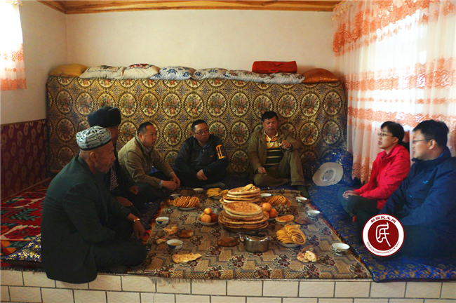 3月4日早晨,工作组带着慰问品赶往阿布拉的家,刚到大门口,阿布拉和他的妻子就迎了上来。热情地问候之后,把我们引入客厅,客厅虽然不大,但十分干净整洁。阿布拉拿着铜壶、铜盆给我们洗手,洗三次后用毛巾擦干净。随后工作组和阿布拉家人盘腿围坐在带花纹的地毯上,一边吃着主人家精心准备的馕、砖茶、汤饭和水果,一边和阿布拉·库尔班拉着家常,就跟自己亲人一样。交谈中发现,阿布拉会讲很多汉语,组长李宏琪说到:“阿布拉,你的汉语说得好,我们工作组都要向你学习,争取在住村的一年里把维吾尔语学好!”