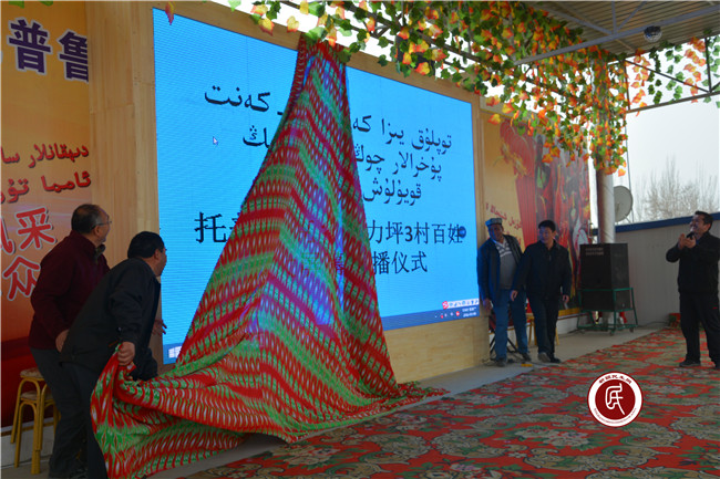 第一份礼物是工作组通过新疆宜化化工有限公司捐赠的价值12万元高清LED大屏幕正式开播了。自治区发展改革委副主任、第三批“访惠聚”活动住村工作组总领队甘昶春、英吉沙县党委常委、宣传部长艾力江·塔西、英吉沙县托普鲁克乡党委书记耿勇等领导参加了揭幕仪式并作重要讲话。这是南疆村级百姓大舞台项目建成后的第一台LED百姓大屏幕。大屏幕连接了广播电视卫星信号,可以让各族群众每天都能收看到新闻、文体等节目,感受到党送给基层群众的温暖,引领村民们明辨是非,增强免疫力。百姓大屏幕还将滚动播放音乐舞蹈影像,通过网络信号实现远程教育、召开视频会议等现代信息化通讯,引领农村现代文化,真正成为群众看得见、摸得着、感受真的惠民项目。