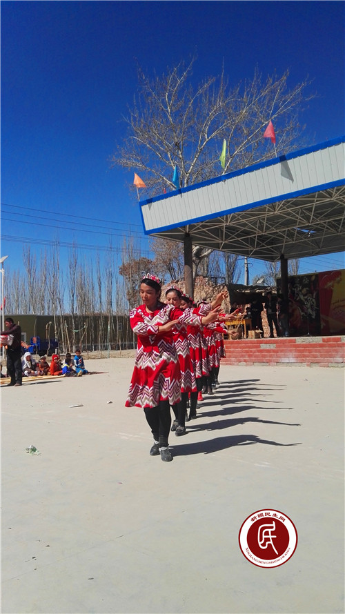 往下是和谐的人文图。一大早,300多名村民穿上最漂亮的衣服,头带花帽,脸上洋溢着喜悦的笑容,走出家门,来到村里的乡村大舞台,共同庆祝诺鲁孜节的来临。