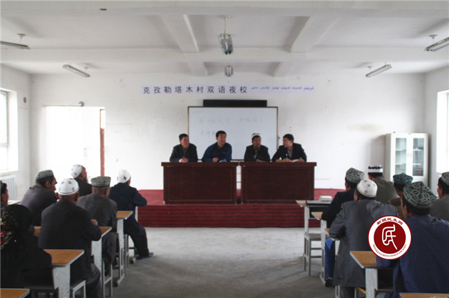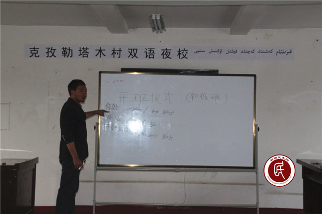 新疆民生网讯 4月4日20:00,莎车县克孜勒塔木管委会克孜勒塔木村双语夜校初级班开课了,自2月25日住村以来自治区发展改革委住克孜勒塔木管委会克孜勒塔木村(1村)“访惠聚”活动工作组一直在筹划双语培训终于得以实施,在今后的两个月村干部、四老人员、保安和工作组每周的一、三、五将在一起共同学习双语。