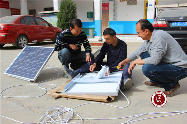 新疆民生网讯 4月18日,一大早,新疆教育学院住巴什克依阔村工作组成员就开始组装太阳能灯的零部件。工作组组长居来提·沙比尔是有理工背景的教授,干这事刚好重操旧业,得心应手,便带着组员热火朝天的干起来了。组装好的太阳能路灯由施工人员拉出去安装,下午,27盏太阳能路灯全部安装到位。
