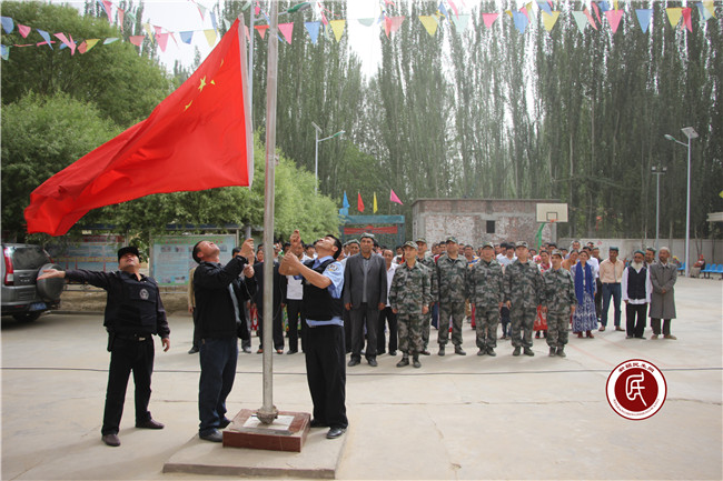 首先是庄严而隆重的升国旗仪式,全体村干部、村民代表、工作组组员参与活动。由村警、协警组成的护旗队迈着整齐有力的步伐,护送国旗踏上升旗台,伴随着雄壮的国歌,鲜艳的五星红旗缓缓升起。这是住村工作组与村两委班子研究决定的,每月一次以及重大节日举行的升国旗活动。