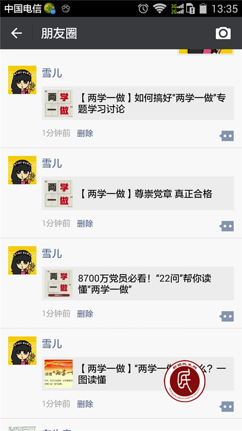 佃坝镇土梁村工作组除集中学习外,创新学习方式开展“两学一做”学习教育。工作组指派专人将各级政府官方微信发布的“两学一做”内容及时发到微信群里,并组织学习、相互提问、互帮互学,激励人人争做合格党员,自觉用党章党规规范自己的言行,积极投身“两学一做”学习教育中。
