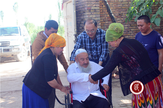 60岁的艾海提·米依提由于在盖自家的富民安居房时不慎摔伤,股骨头坏死造成一级伤残,本来越来越好的小日子由于伤残再次变得贫困,艾海提·米依提也变得寡言少语,工作组一直将这件事放在心上。在工作组的协调下,在自治区残联的大力支持下,五月中旬,住托马贝希村工作组与村干部一起来到艾海提·米依提家中,将慰问金和轮椅送到了他的手中,向他表达了党的温暖和关怀。工作组鼓励他们要把党和政府的关心转化为自强不息的信心,转化为顽强拚搏的动力,乐观的面对生活,争做一名坐在轮椅上的强者。艾海提·米依提坐上崭新的轮椅,激动的说“谢谢工作组,谢谢村委会!我受伤躺在床上,看到家里的日子越来越差的时候我心情很不好,但是现在看到还有你们关心,我心里很温暖,感谢党,感谢政府。”