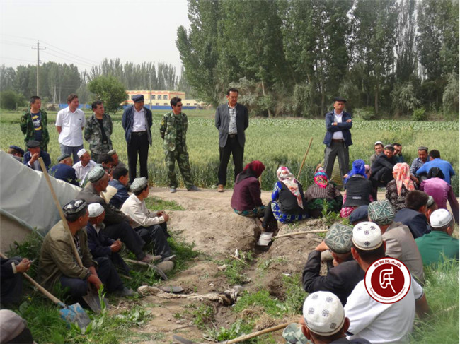 (图为村党支部书记和工作组总领队在田间地头为村民宣讲的现场)