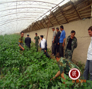 (图为观摩人员在种植户的设施大棚内对比评优)