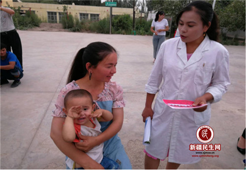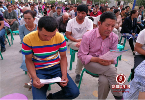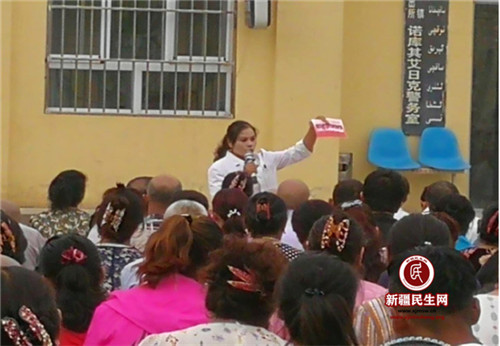 新疆民生网(古再努尔·艾海提)2019年7月29日,阿克陶镇诺库其艾日克村加大健康扶贫政策宣传力度,利用升国旗之机对全村村民进行了健康扶贫政策宣传。